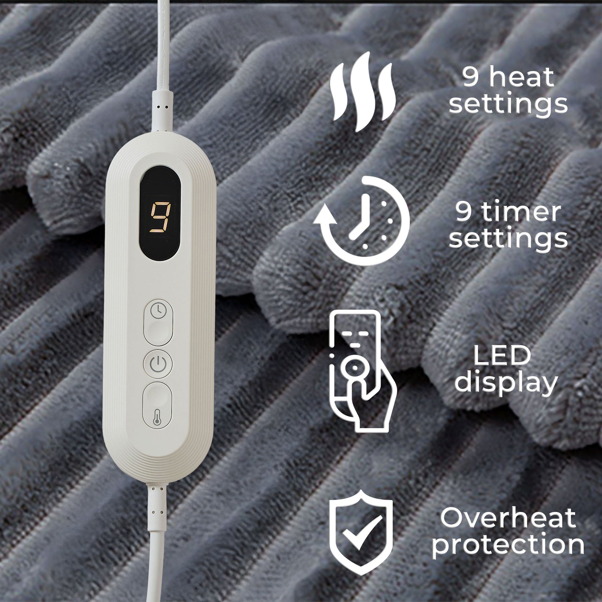 - Snelle opwarmfunctie die deken binnen enkele minuten zijn maximale warmte laat bereiken, waardoor on middellijke comfort wordt geboden in koude omstandigheden.
