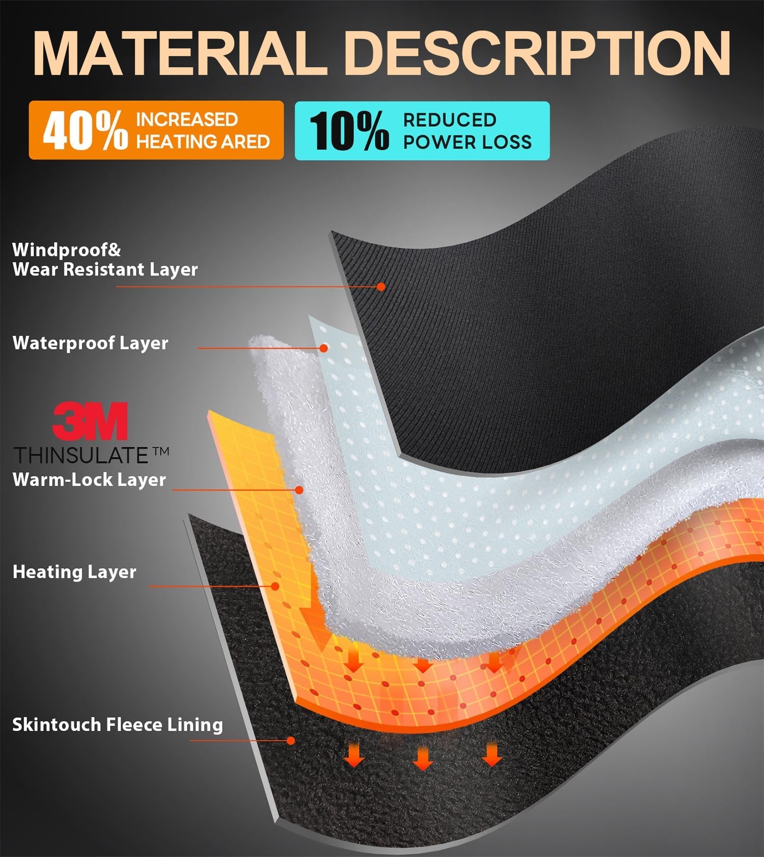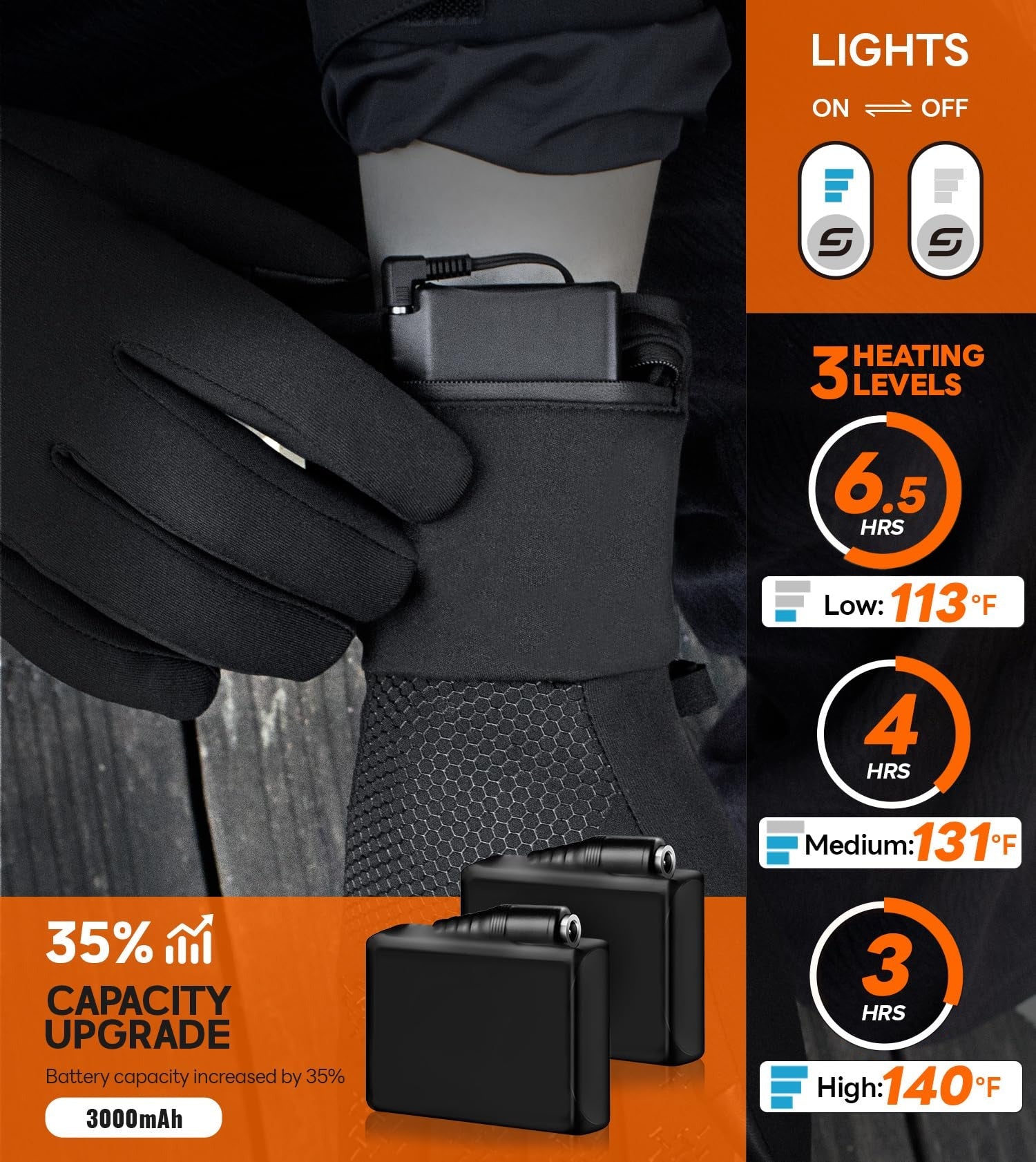 Chaleur durable : Dotés d'une puissante batterie rechargeable de 7,4 V et 3 000 mAh, ces gants diffusent une chaleur constante, assurant ainsi que vos mains restent au chaud lors de toutes vos aventures par temps froid.