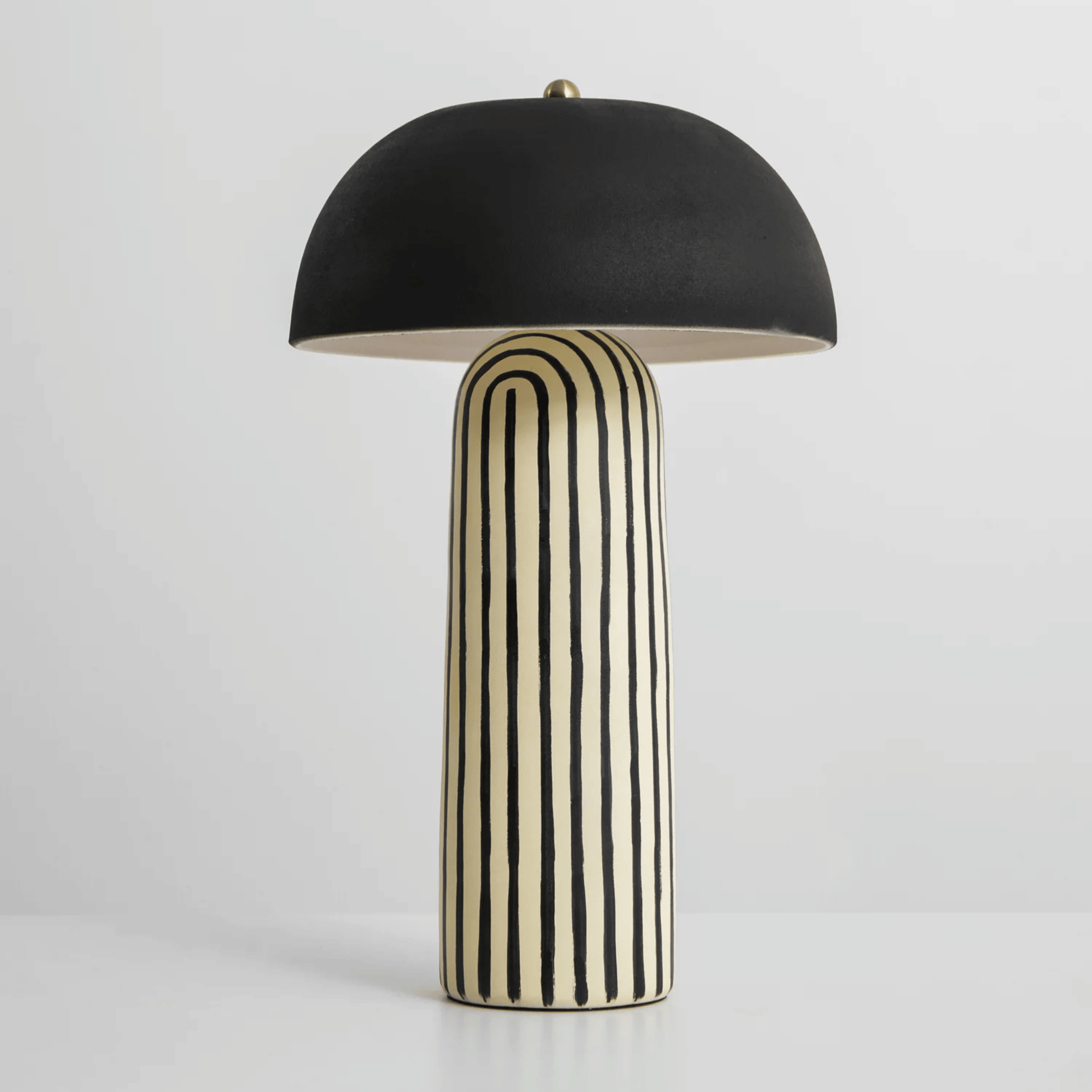 ✨ Quand l'art rencontre la lumière ✨ Transformez votre espace de vie en un havre de style et de sophistication avec la lampe de table en céramique rayée Modaré . Cette lampe exceptionnelle n'est pas qu'une simple lampe ; c'est une pièce maîtresse qui allie avec élégance minimalisme moderne et raffinement artistique intemporel . Son design géométrique audacieux en noir et blanc, sa silhouette unique en forme de champignon et son corps en céramique épuré en font un complément idéal pour les chambres, les salons ou tout intérieur design. 🛋️