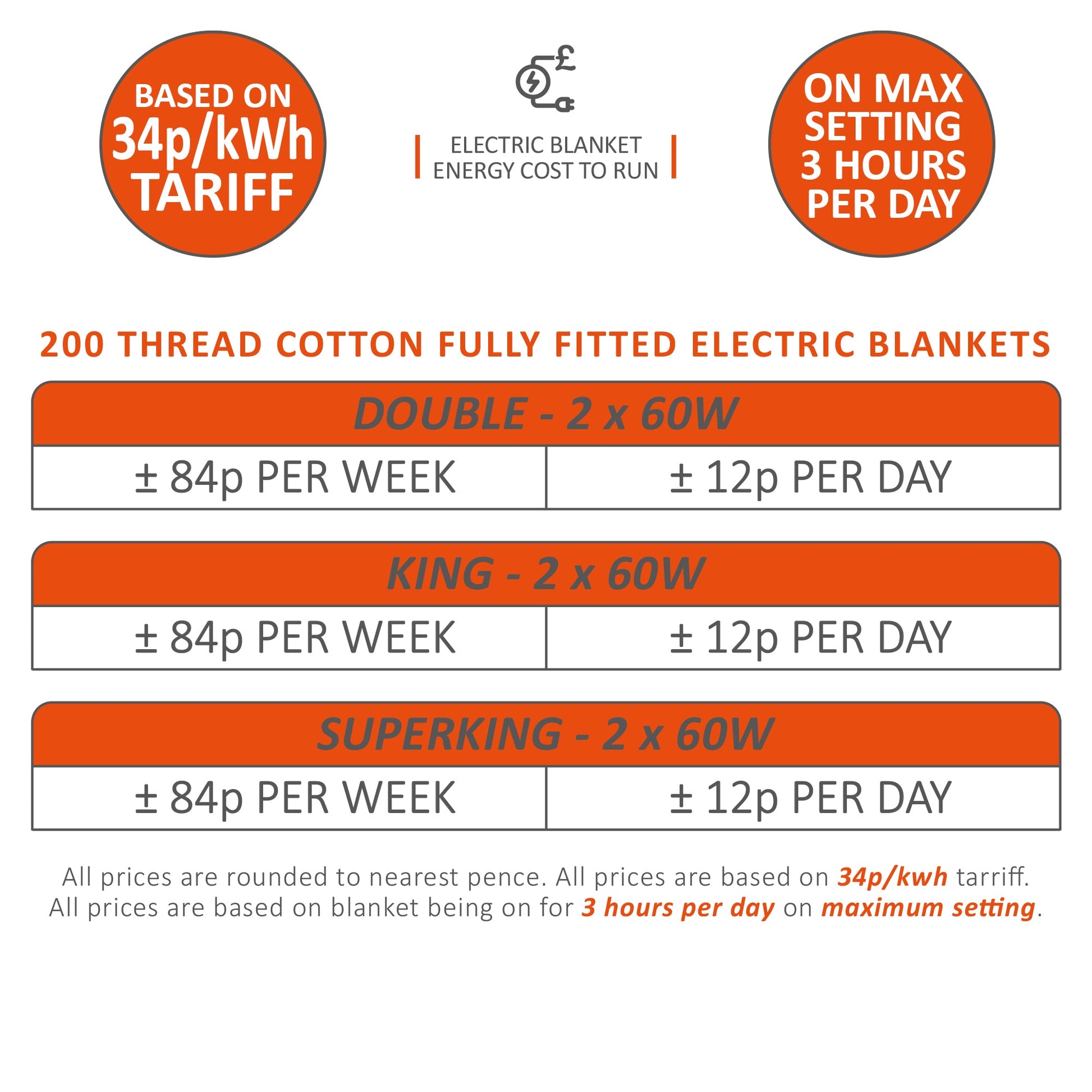 ECONOMISCH: Deze deken verbruikt 120W aan stroom, wat betekent dat je beide zijden van de deken op de hoogste warmtestand gedurende 3 uur kunt laten draaien en het je 12 cent per dag kost. Dit betekent dat je deze winter warm en gezellig kunt blijven zonder je zorgen te maken over een enorme stijging van je energiekosten.